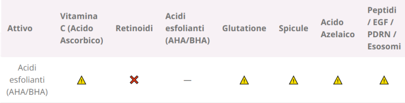 Gli esfolianti più comuni e a rischio interazioni sono gli AHA (Acido Glicolico, lattico, mandelico) e BHA (Acido Salicilico) a concentrazioni non basse (circa sopra il 2% per gli AHA e 0.5% per i BHA)
