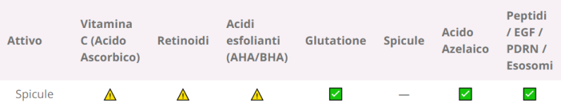 Le spicule sono micro-strutture minerali (o derivati) che favoriscono la penetrazione degli attivi, spesso usate come booster. Si trovano spesso nei prodotti che contengono il nome "Shot" o "Reedle"